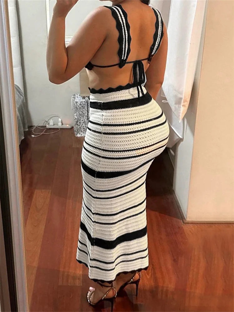 CHRONSTYLE Women 2 Pieces Knitted Skirts Outfits Striped Print Cropped Tank Tops with High Waist Slim Long Skirts Set Beach 2024