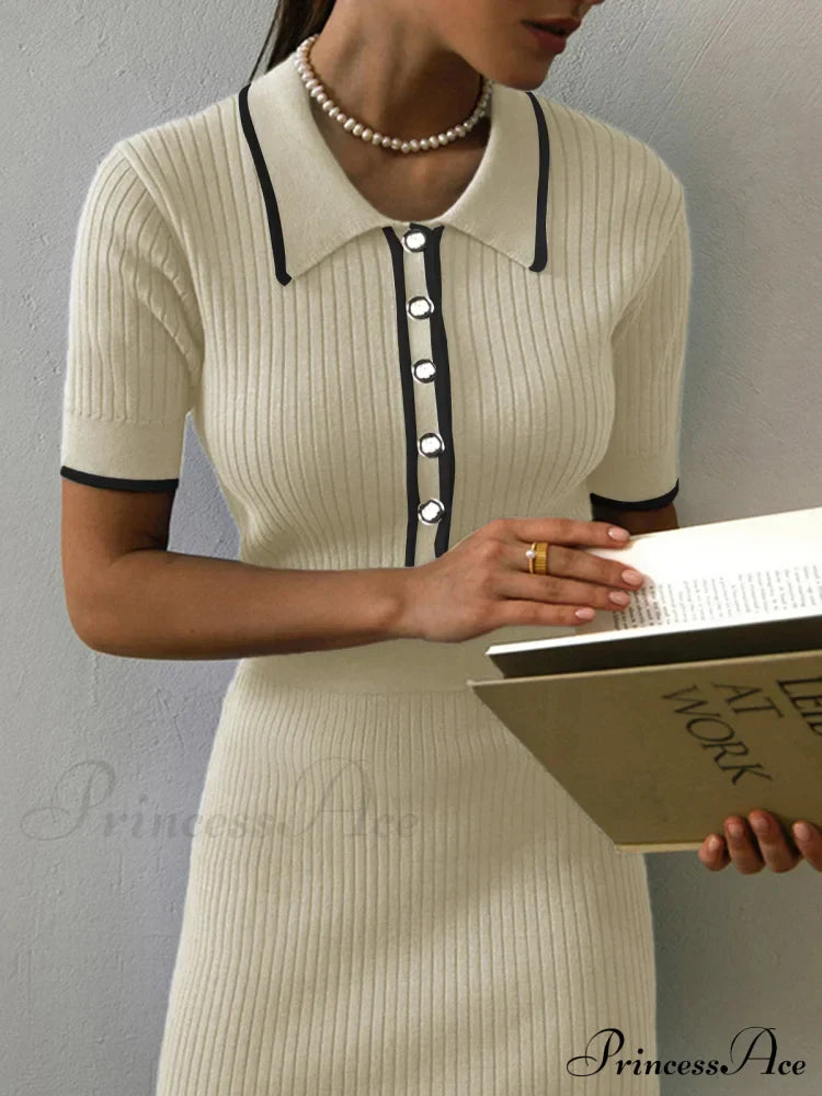 Contrast Trim Collared Rib Modern Knit Short Sleeve Midi Dress