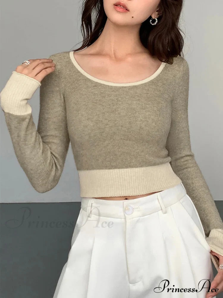 Contrast Hem Long Trendy Sleeve Crop Knit Top