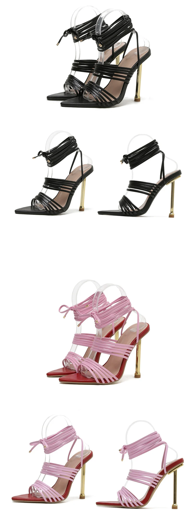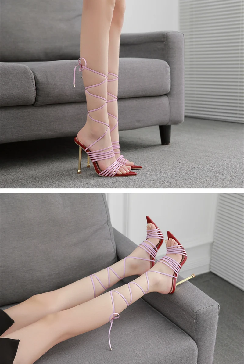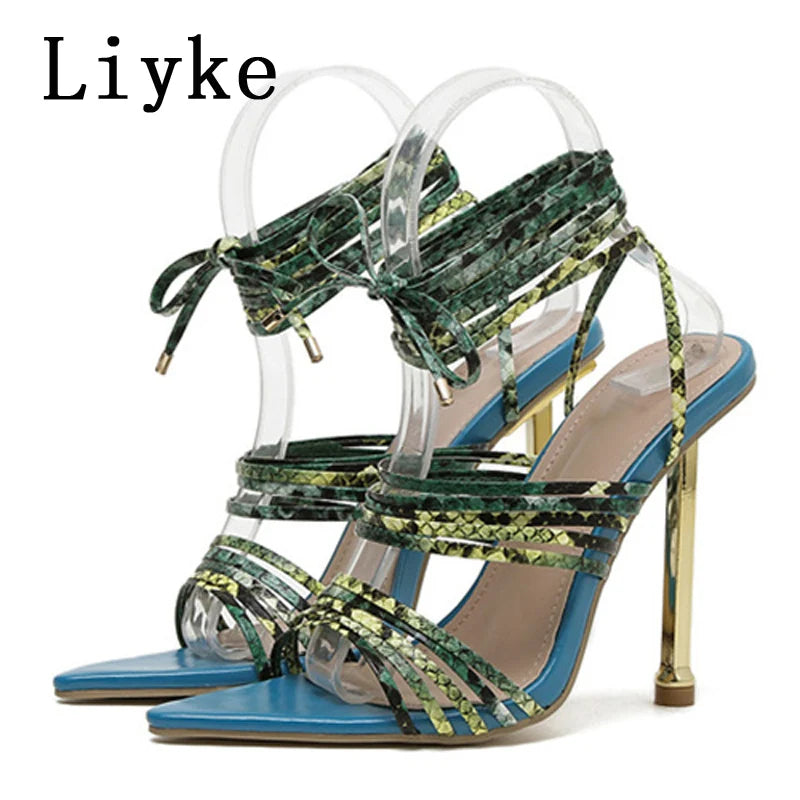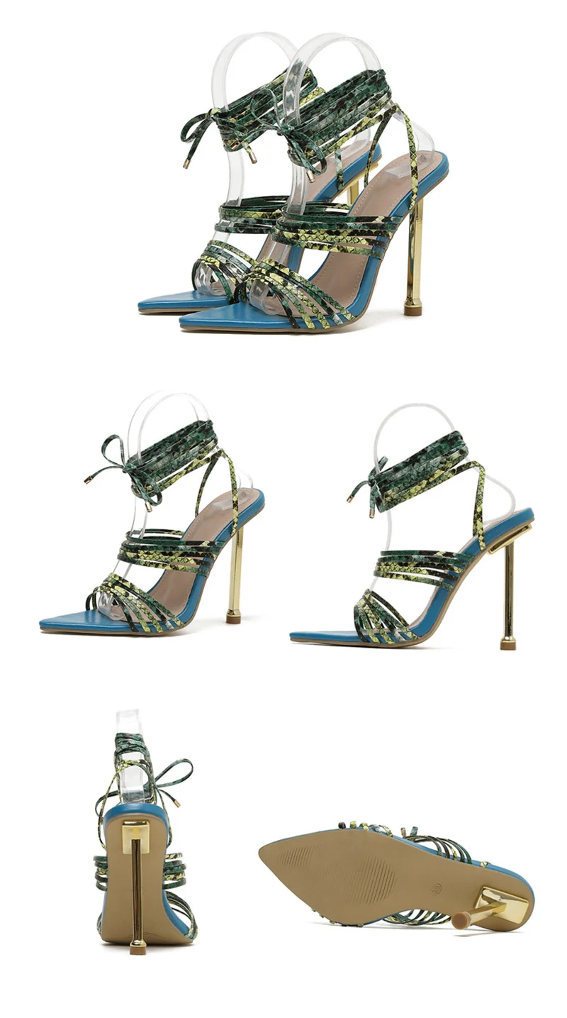 Red Blue Thin High Heels Sandals Size 35-42 Pointed Toe Snake Print Lace Up Shoes Female Pumps Summer Fashion