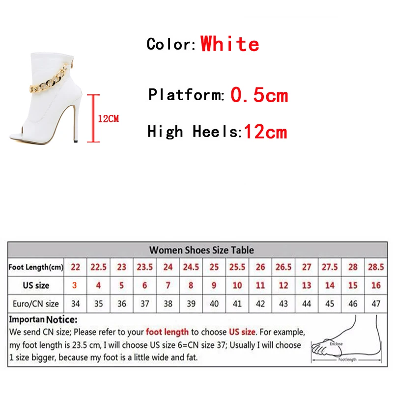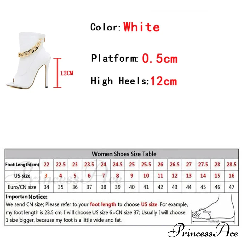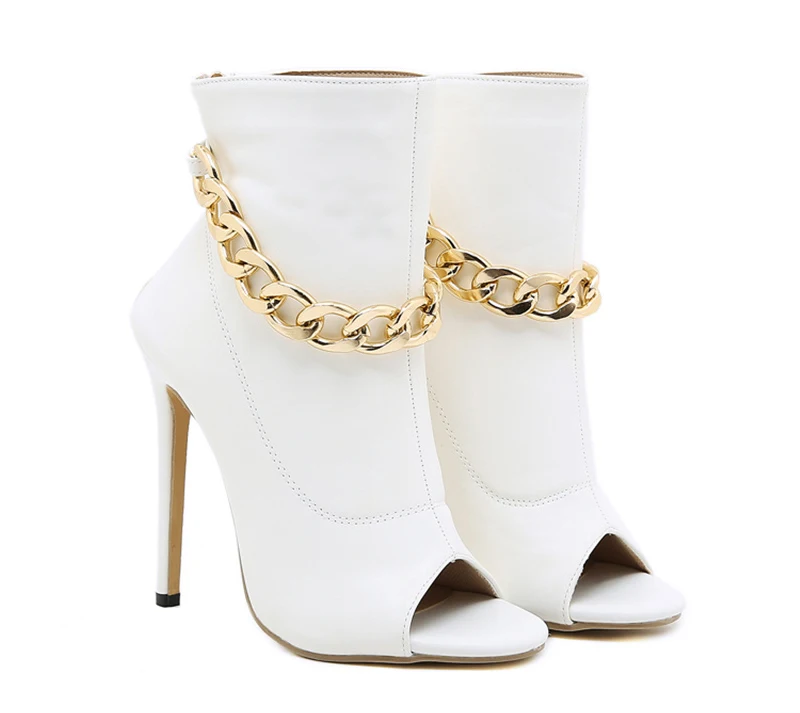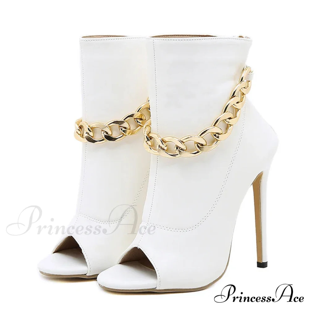 White Leather Ankle Sandals with Metal Chain Design and Thin Heels Peep Toe Zip Boots for Women with High Quality Leather Fashionable White Pumps with Metal Chain Detail and Thin Heels