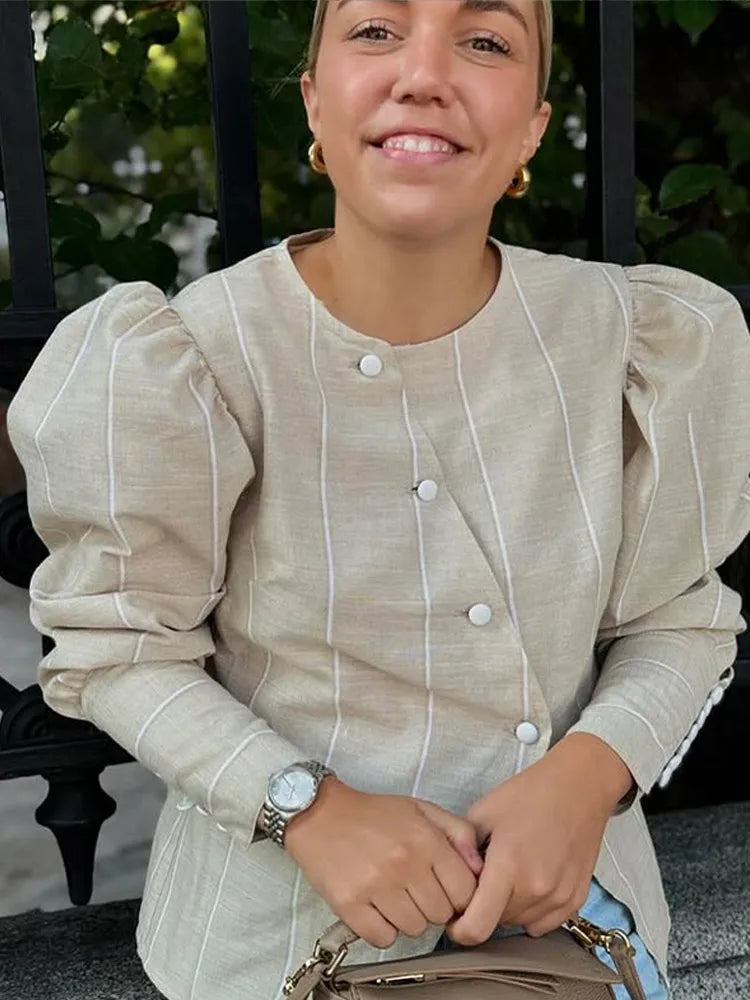 Bubble Sleeve Slanted Button Stripe Bloshope