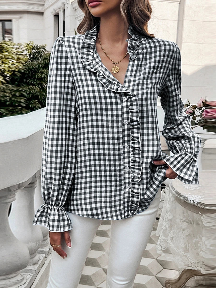 Plaid Ruffle V-neck Bloshope
