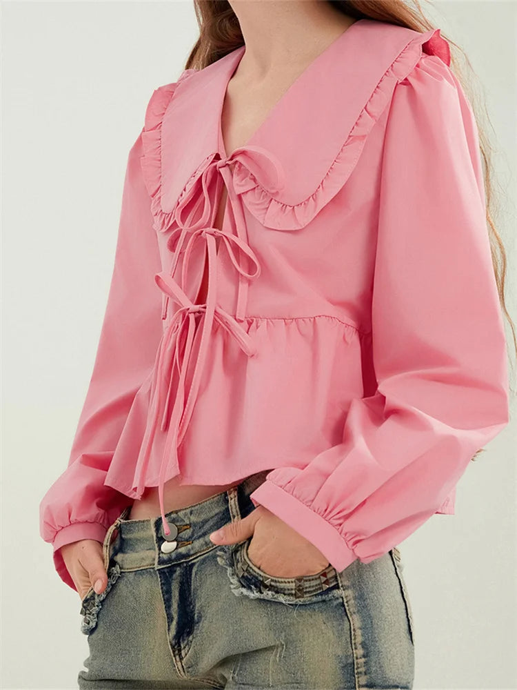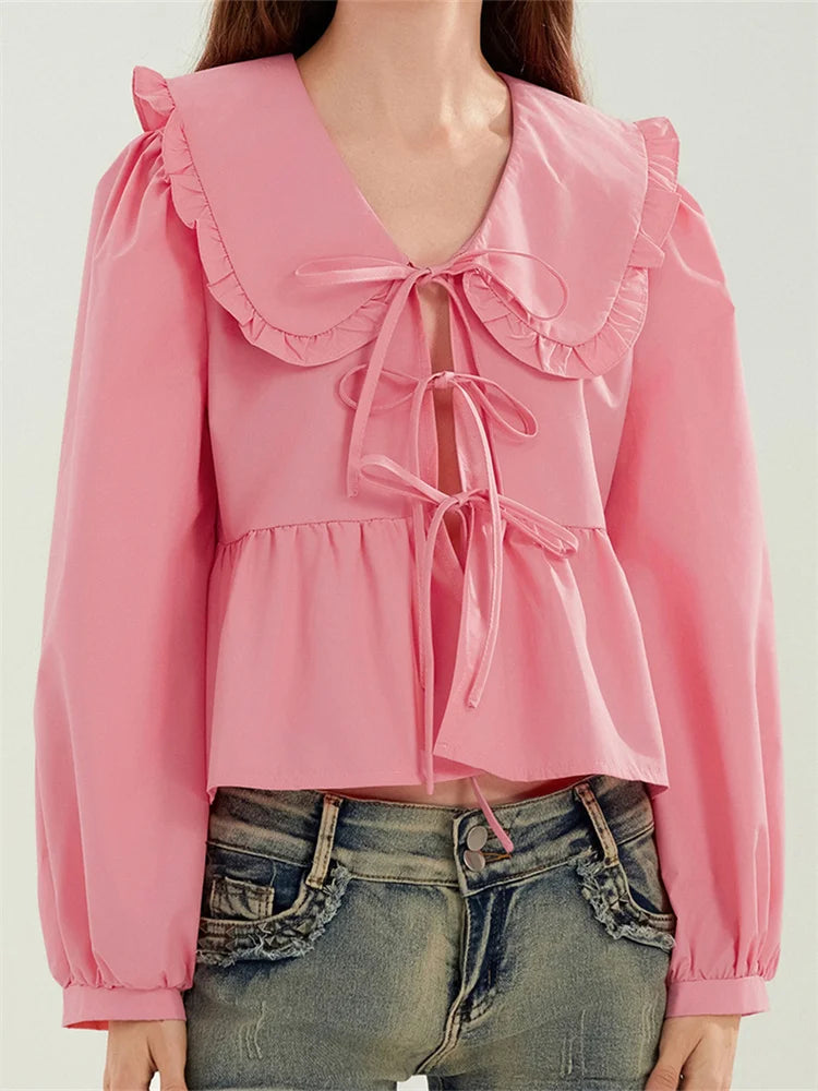 Ruffled Turn-Down Neck Tie-Up Bloshope