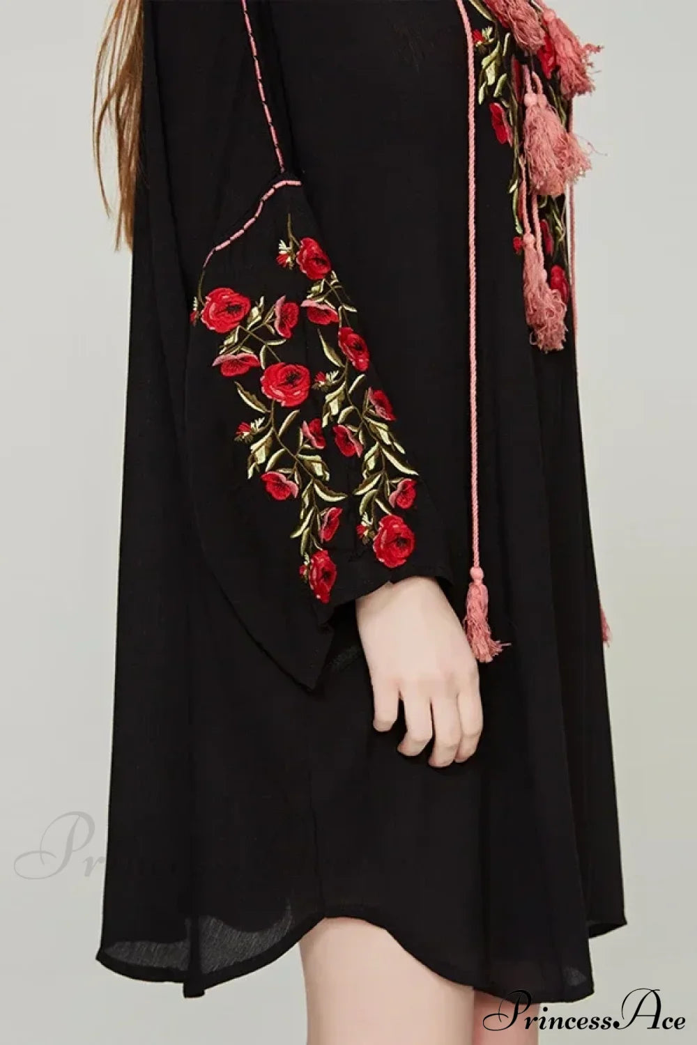 Black Cotton Rayon Floral Embroidery Beach Dress