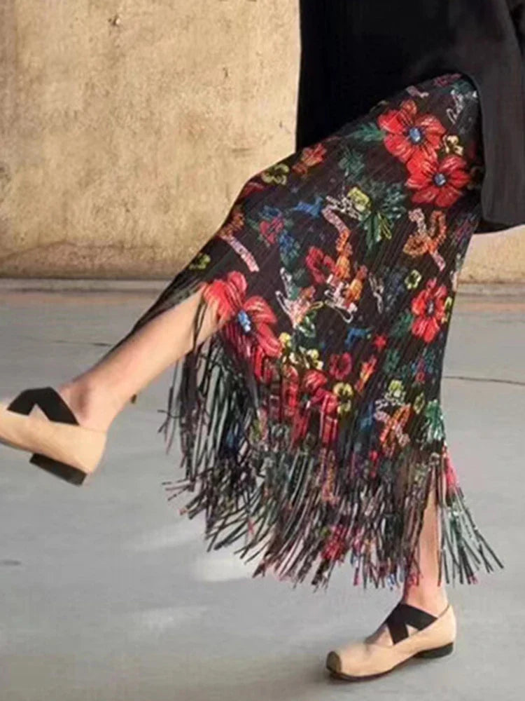 Fashion Printed Flower Tassels High Elastic Waist Skirt