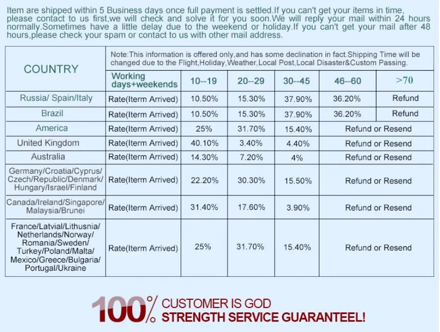 6. If you have not received your shipment within 50 days from payment, please contact us. We will track the shipment and get back to you as soon as possible with a reply. Our goal is customer satisfaction!