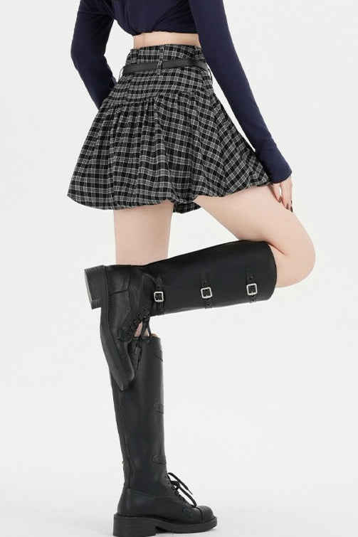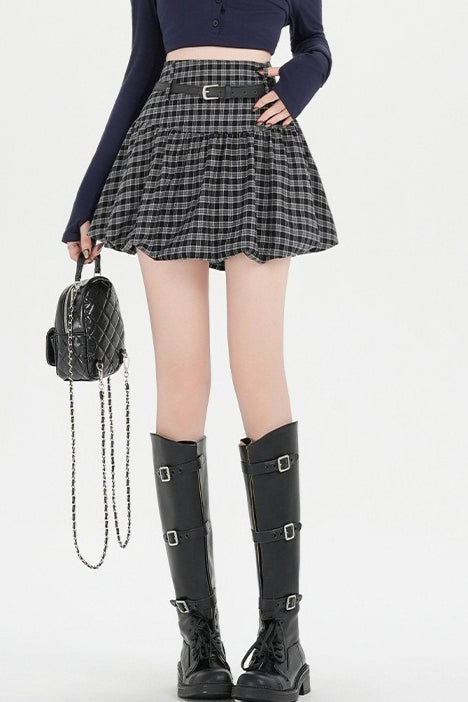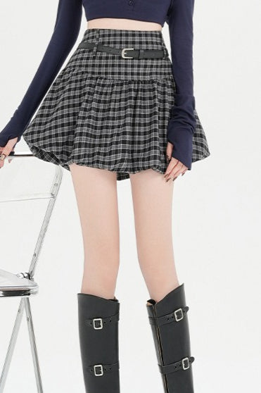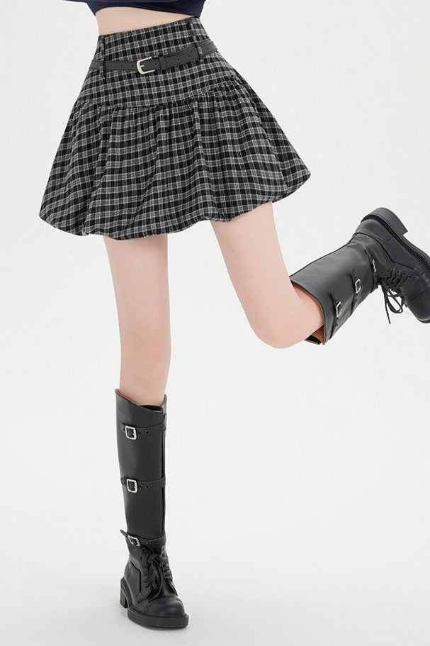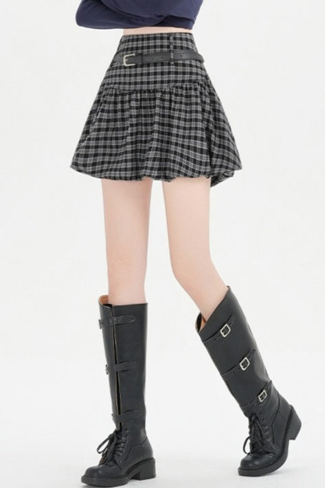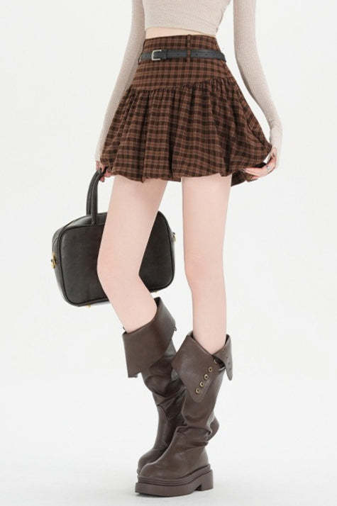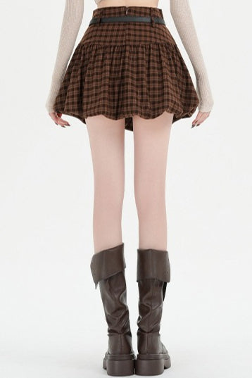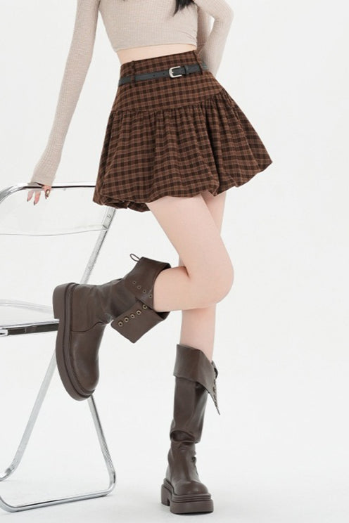 Plaid Bubble A-line Khaki Short Skirt