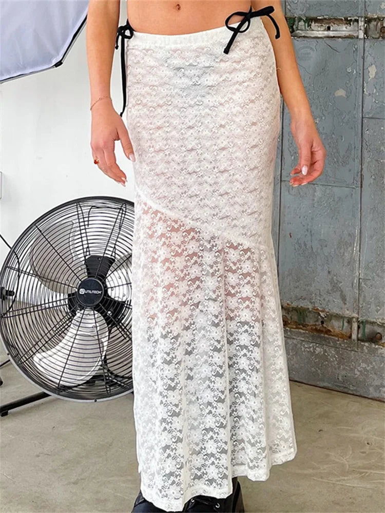 Y2K Grunge Lace Mesh See Through Bow Tie Long Skirt