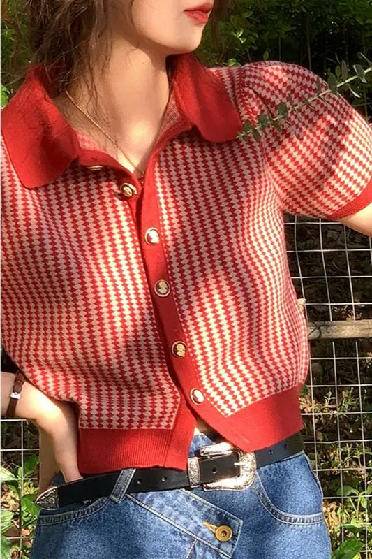 Thin Knit Turn-down Collar Short Sleeve Cardigan