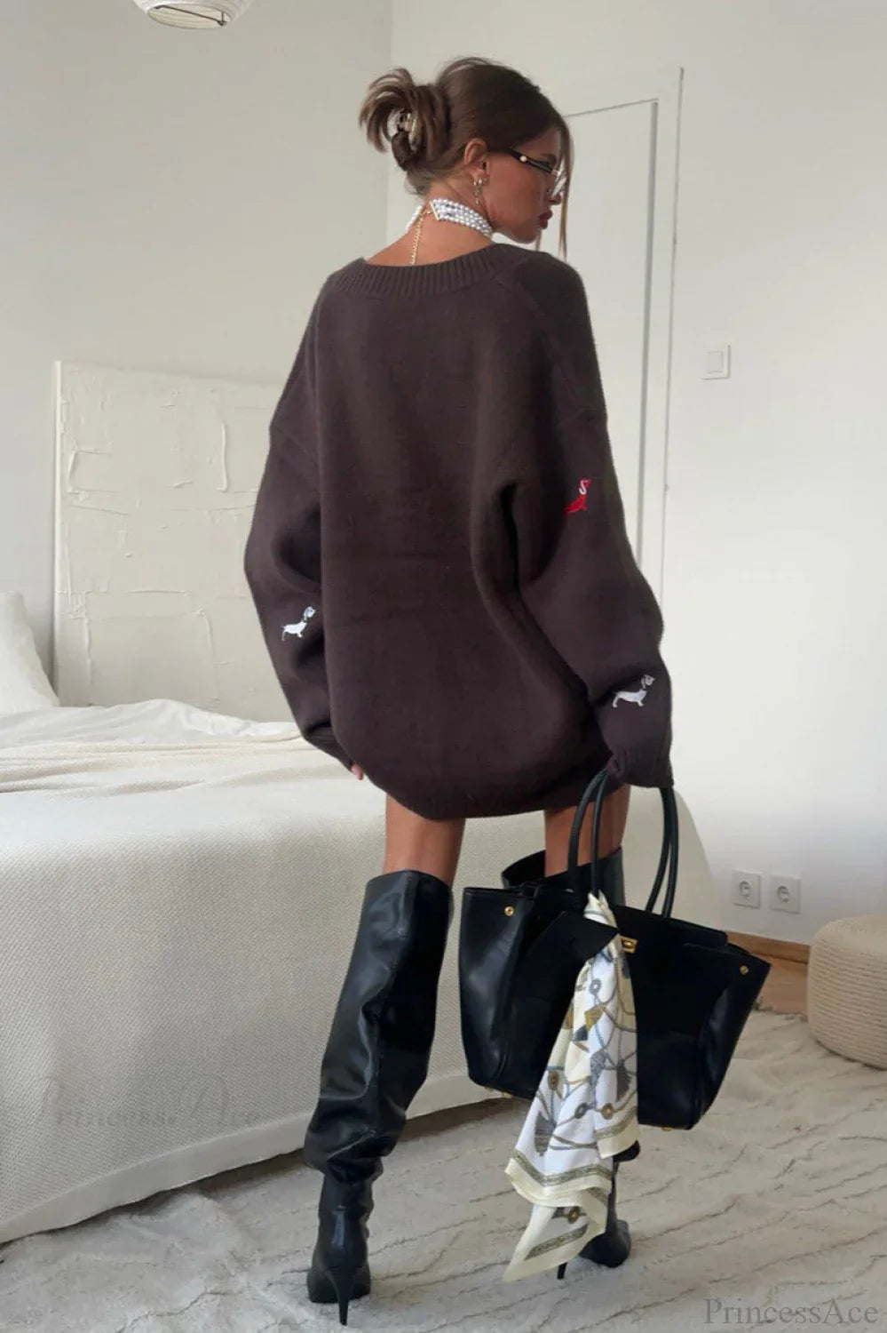 Loose Dachshund Embroidery Knit Button Cardigan