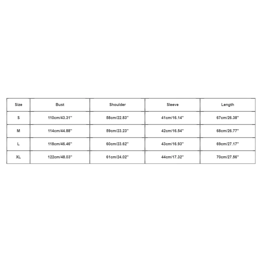 | Size:XL | Bust:122cm/48.03'' | Shoulder:61cm/24.02'' | Sleeve:44cm/17.32'' | Length:70cm/27.56'' |