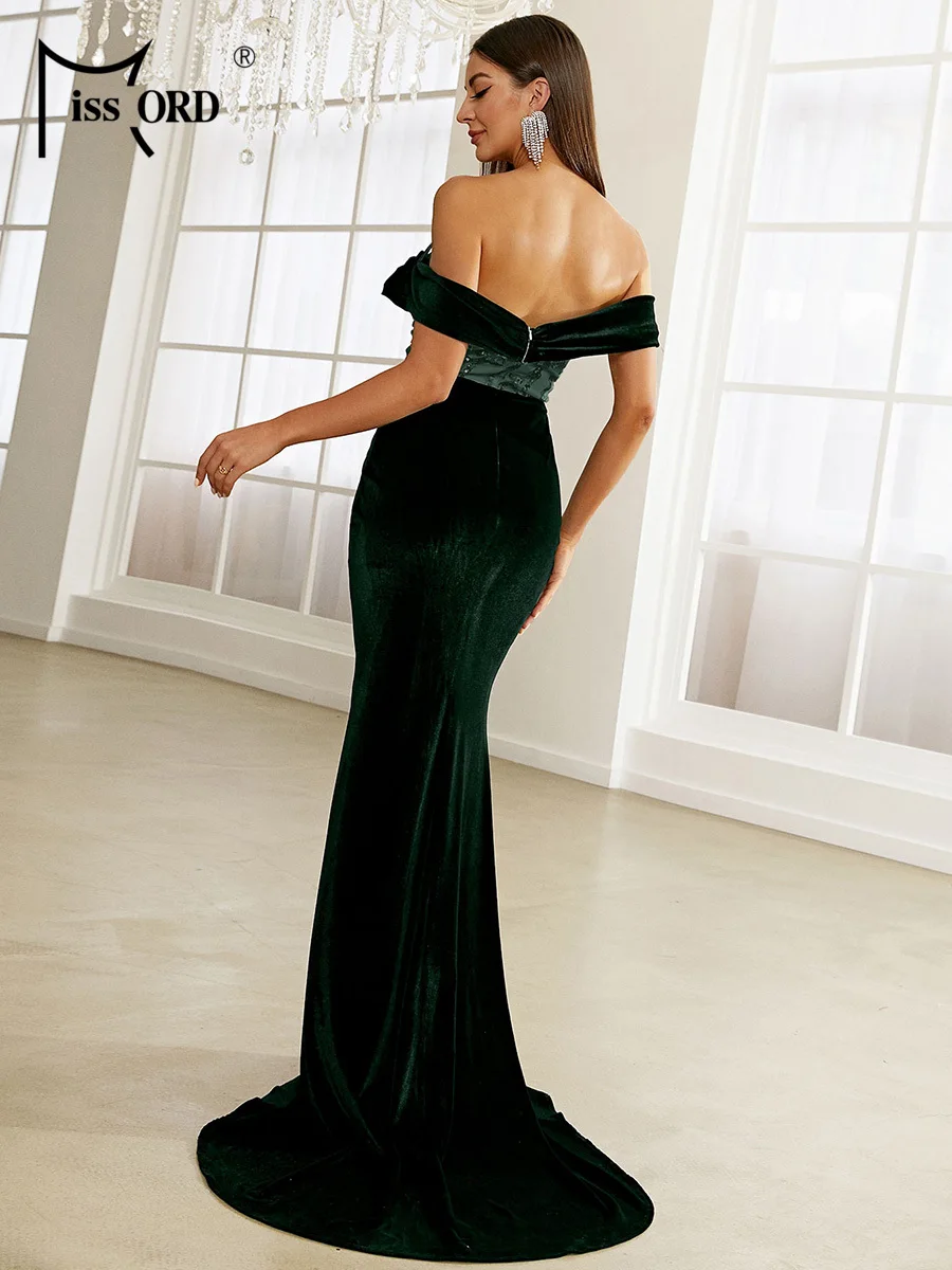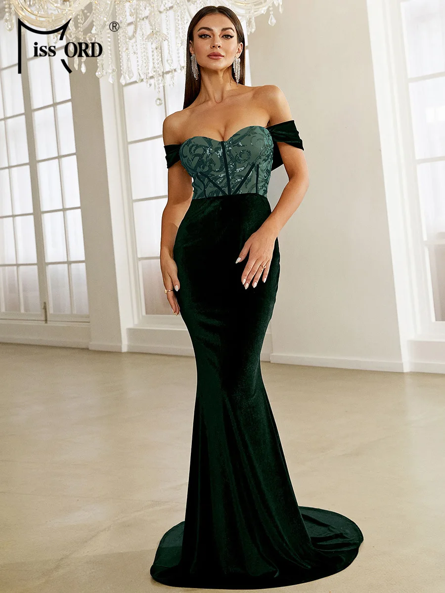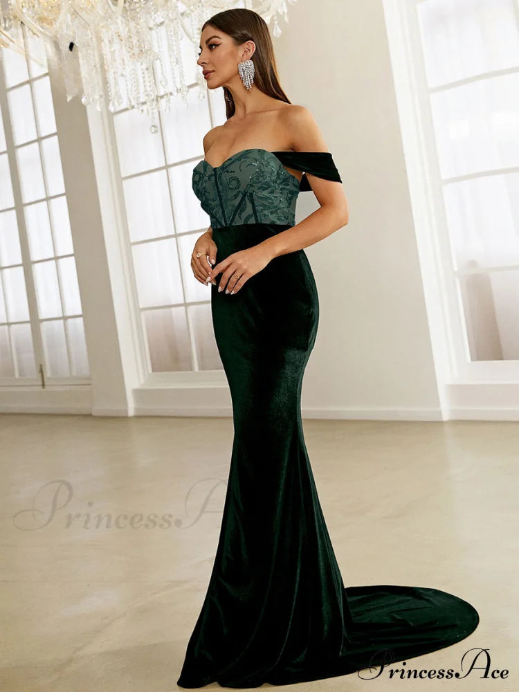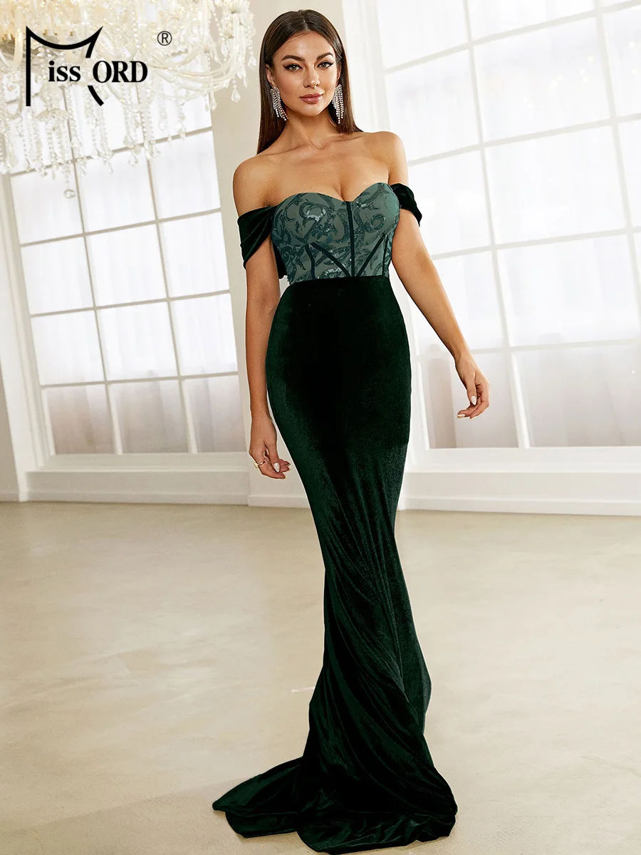 Green Velvet Evening Dress Elegant Off Shoulder Sequin Bodycon Maxi Christmas Party Dress