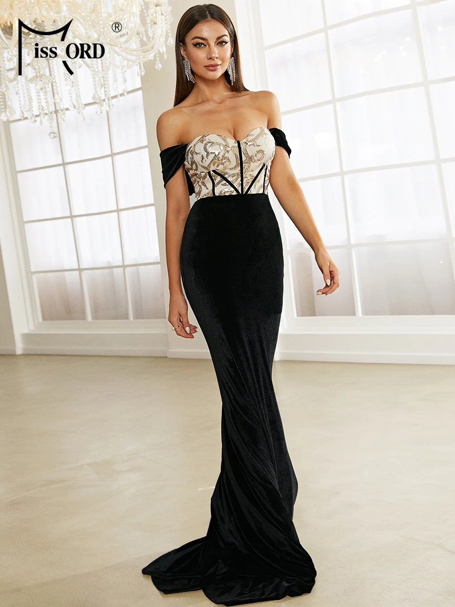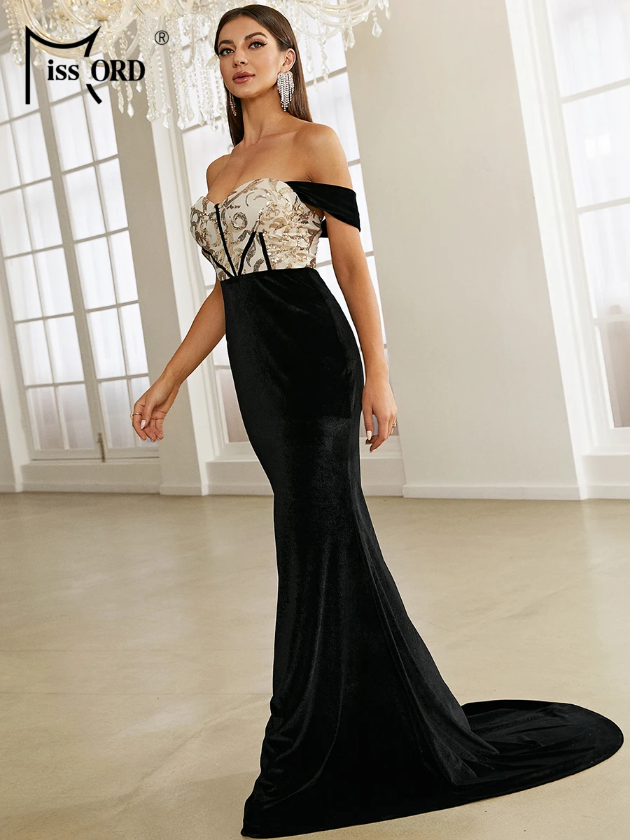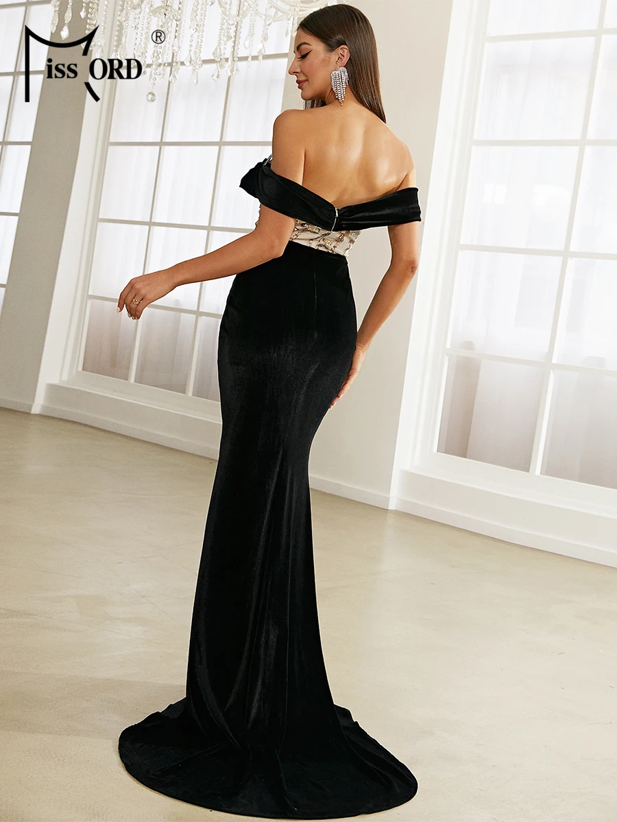 Green Velvet Evening Dress Elegant Off Shoulder Sequin Bodycon Maxi Christmas Party Dress