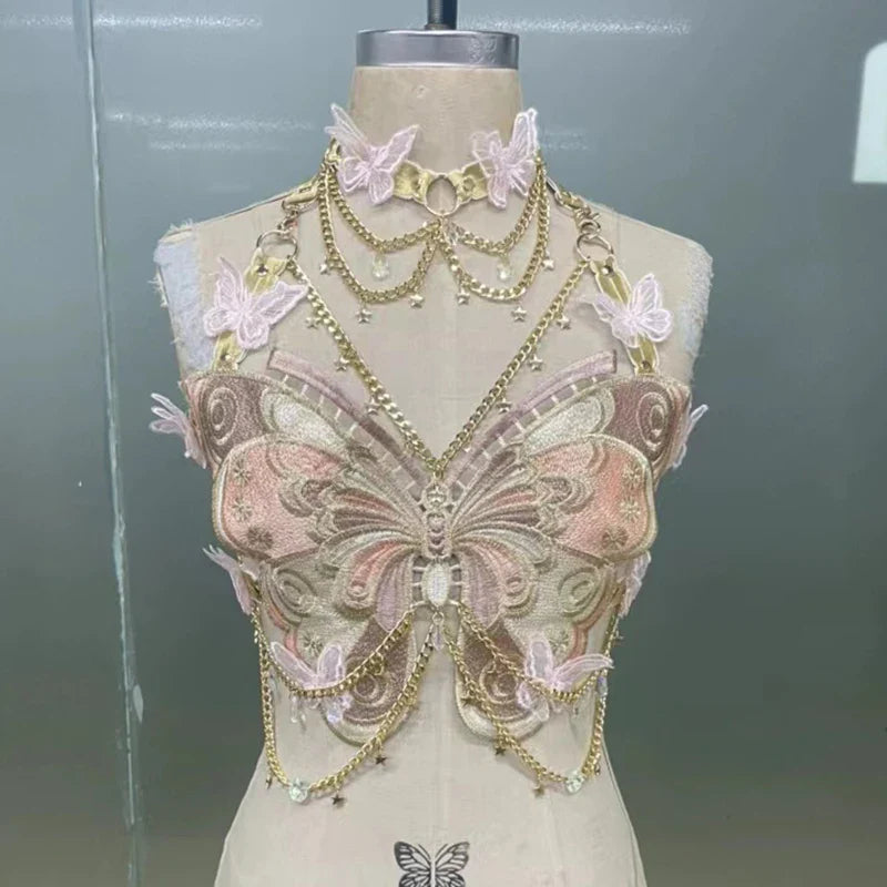 Butterfly Embroidered Crystal Chain Backless Crop Top