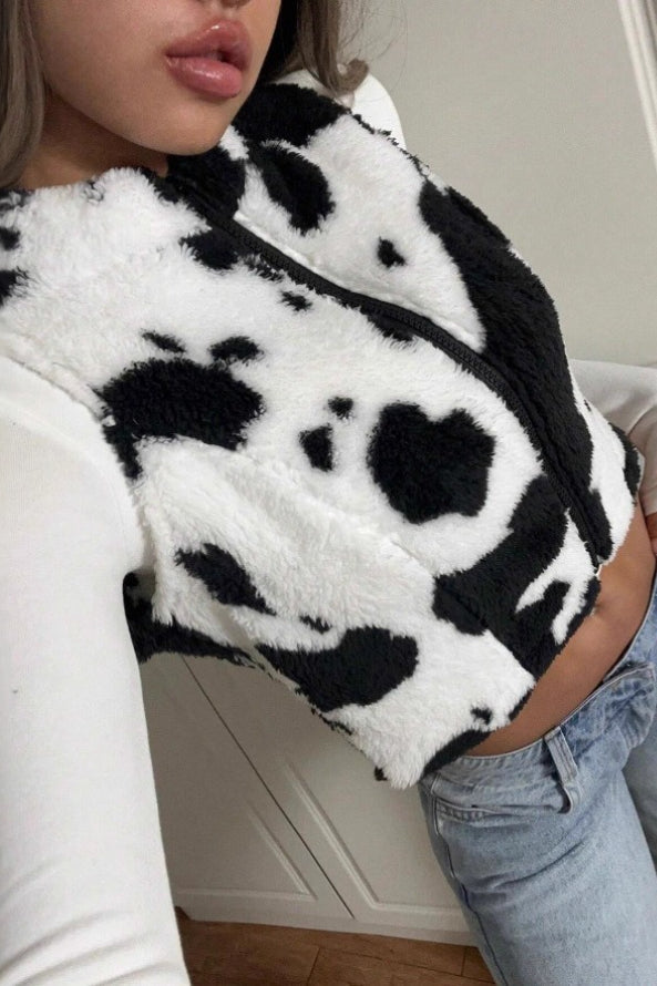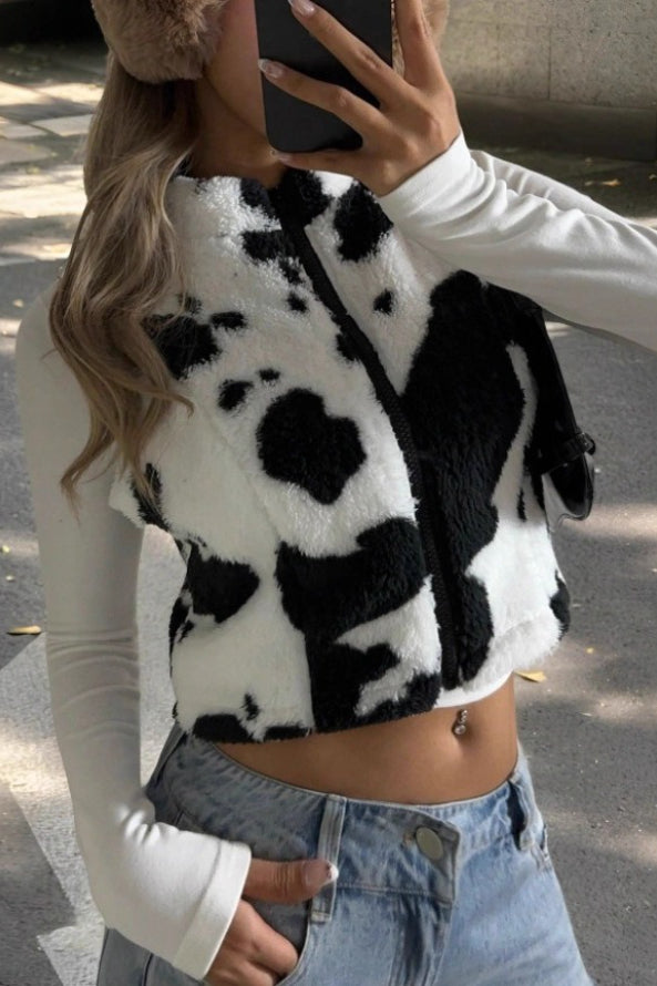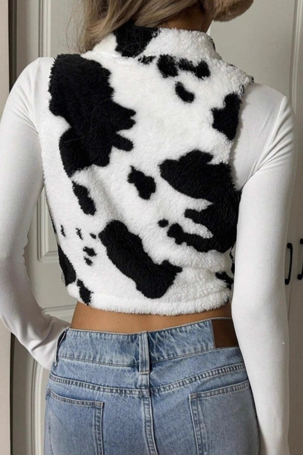 Cow Print Zipper Fuzzy Sleeveless Vest