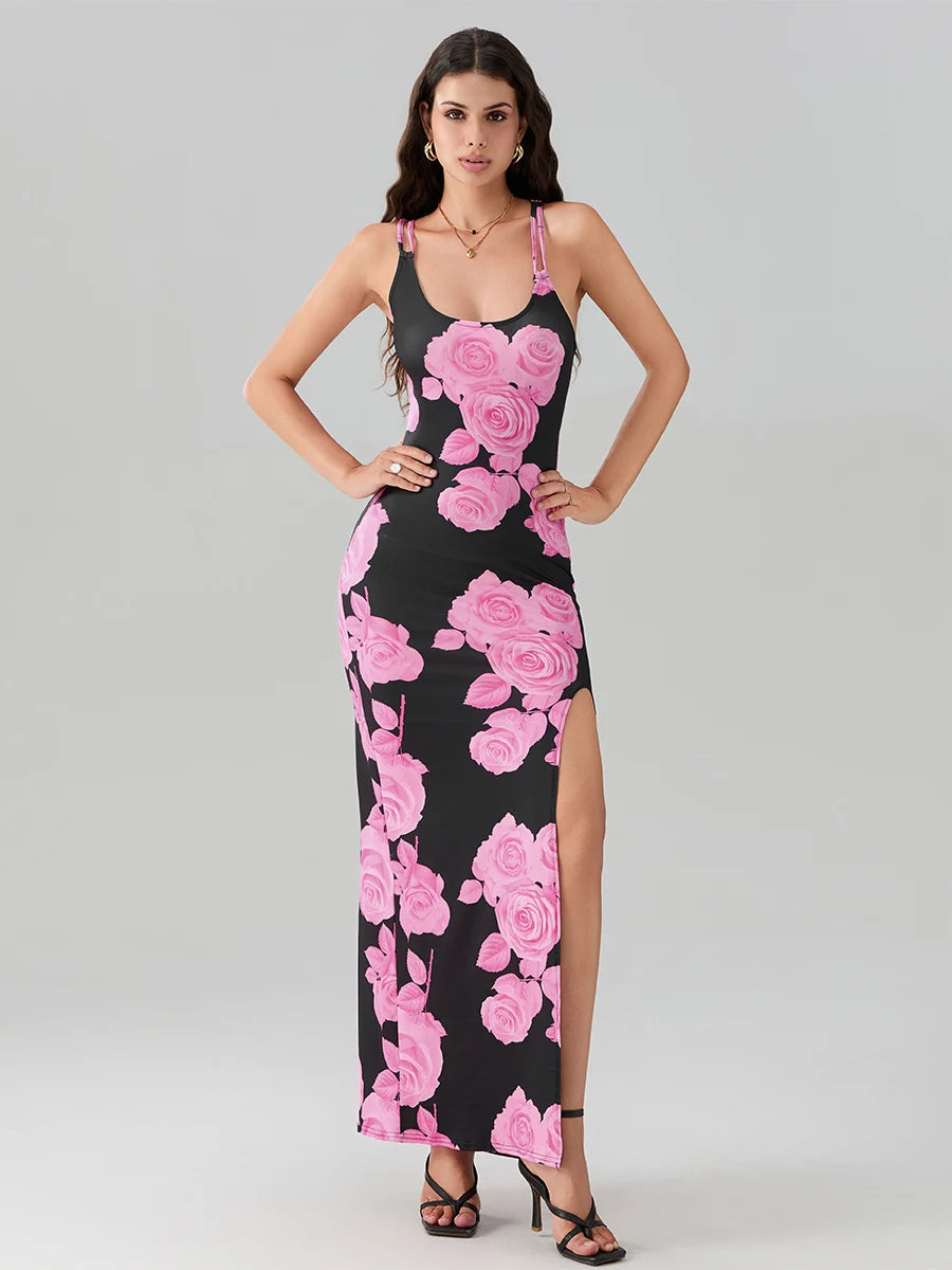 Open Back High Split Floral Print Bodycon Cami Club Floral Dress