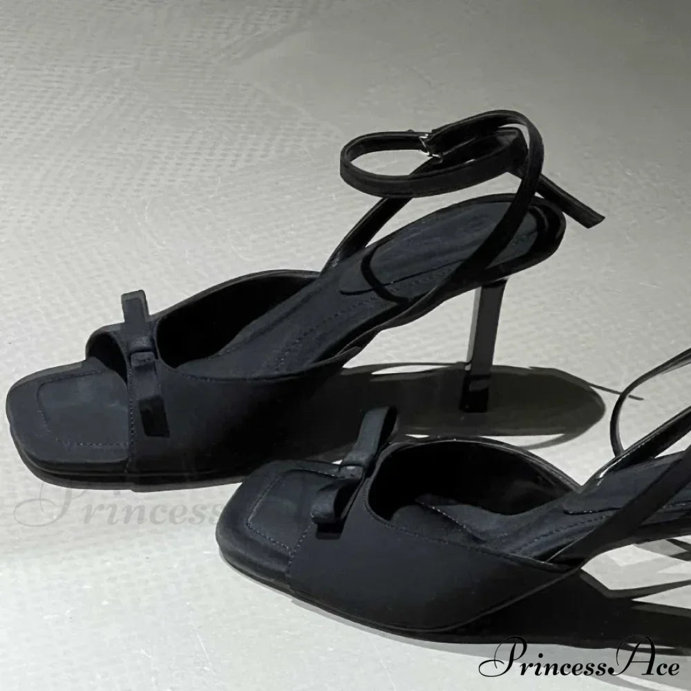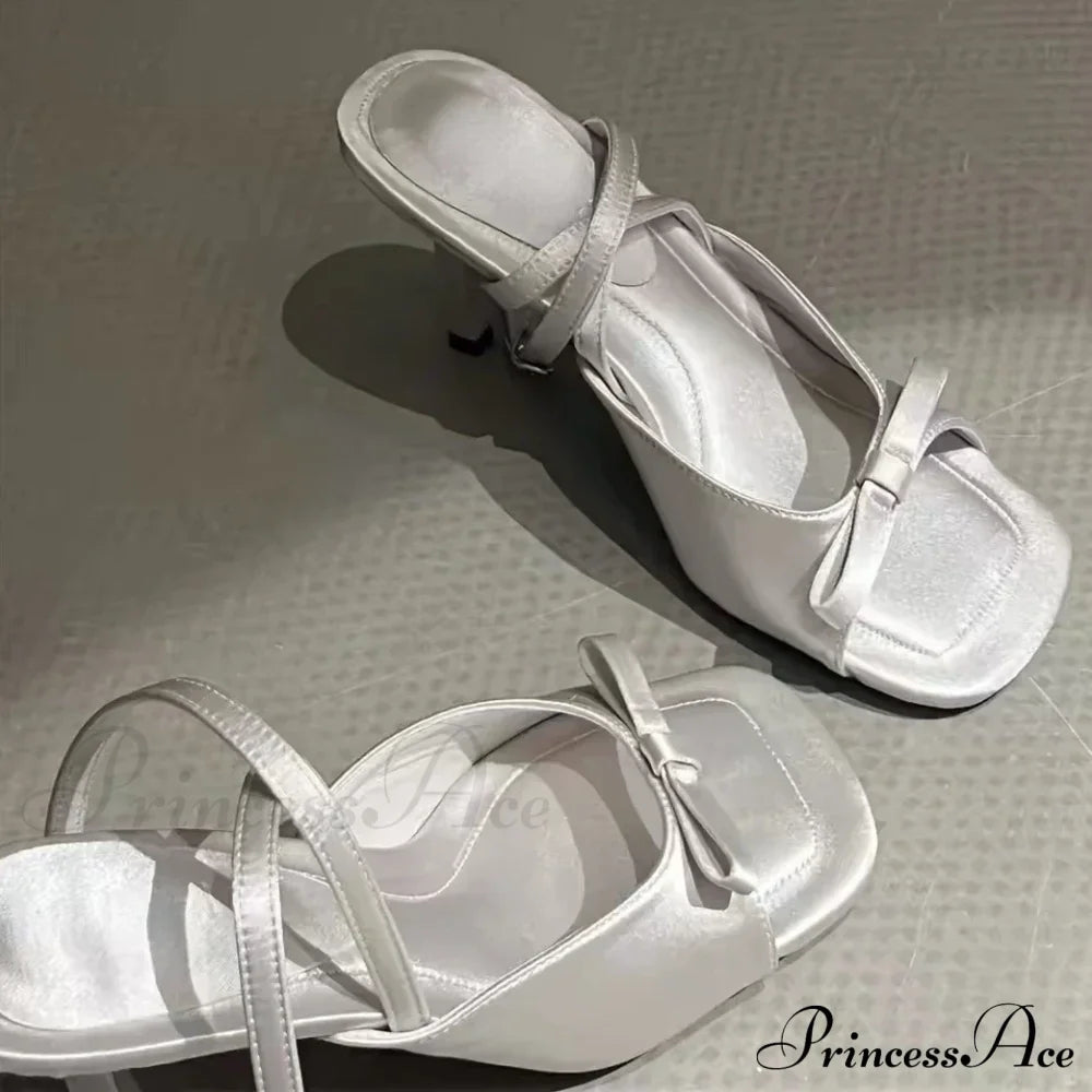 Bow Satin Luxury Designer Elegant Ankle Strap Square Toe Mules Pumps Slingback High Heel