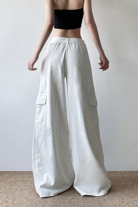 Long Zipper Pocket White Cargo Wide Leg Jeans