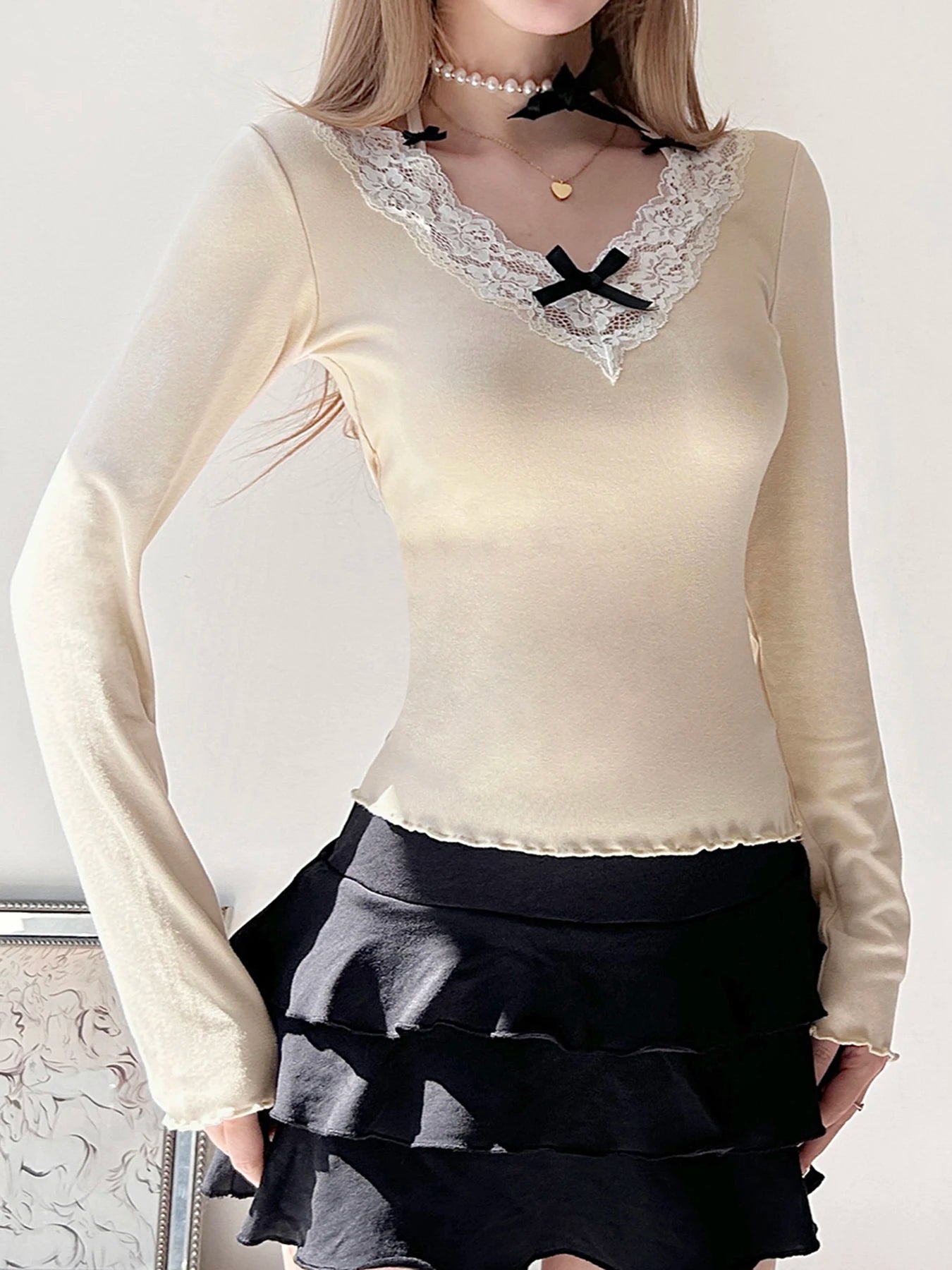 Bow Patchwork Lace Trim Halter V-Neck Long Sleeve Knit Top