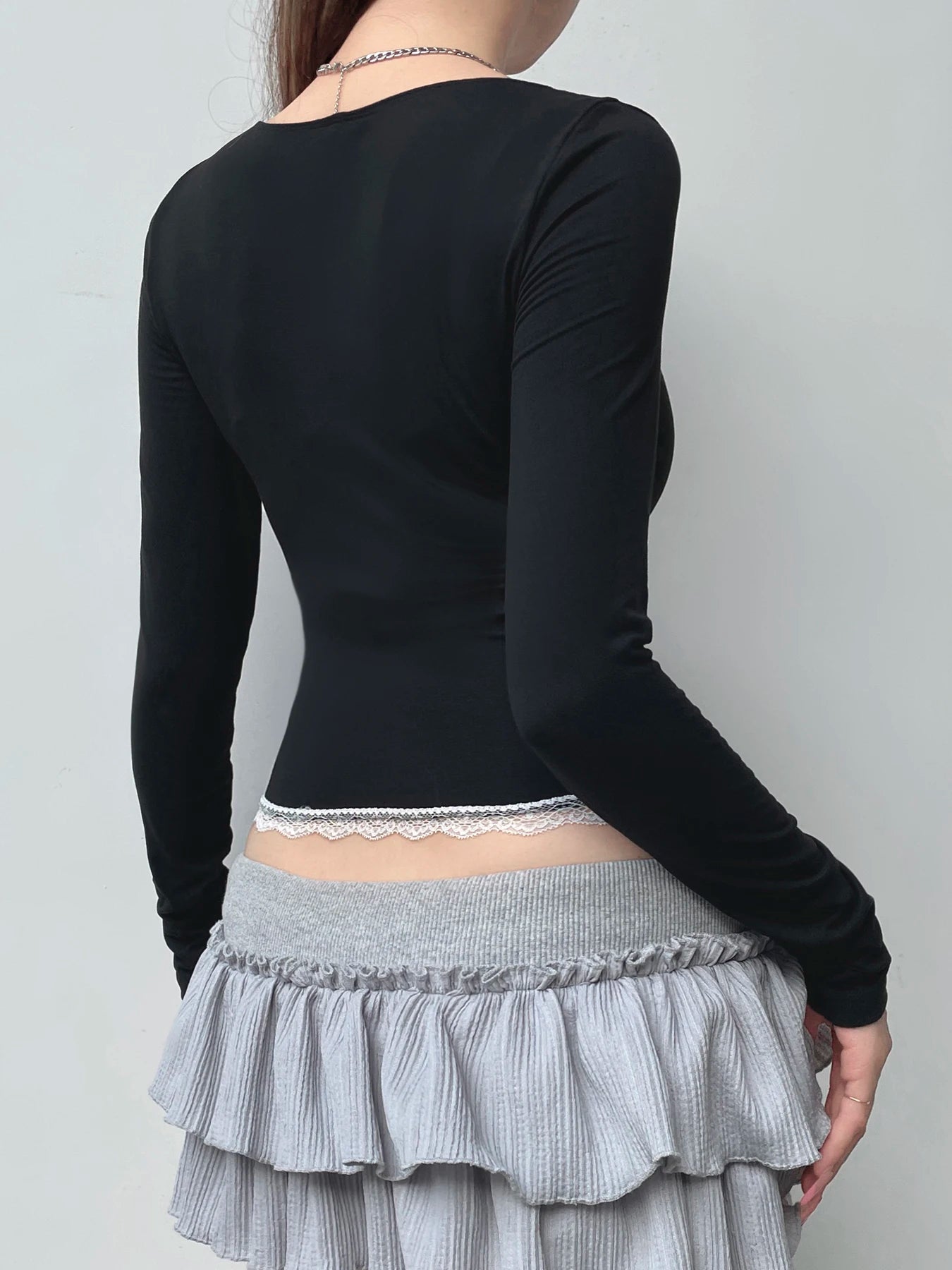 Sweet Lace Trim Cropped Square Collar Long Sleeve Knit Top