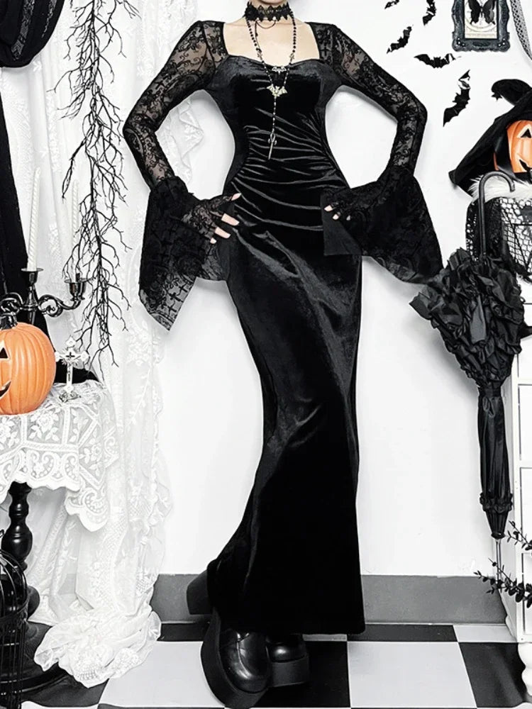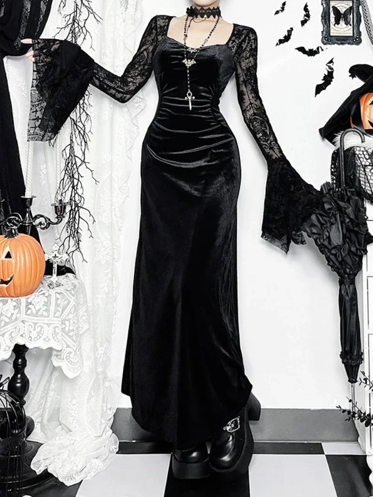 Antique Flare Sleeve Square Collar Full-Length Dress