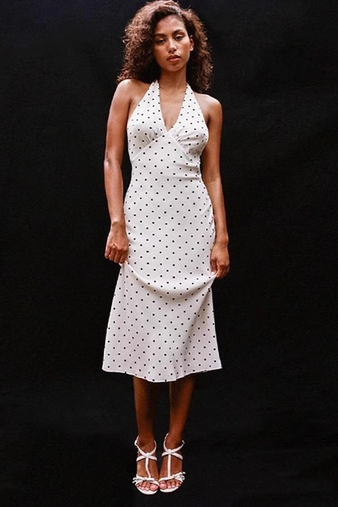 Retro Halter V Neck Polka Dot Sexy Midi Dress