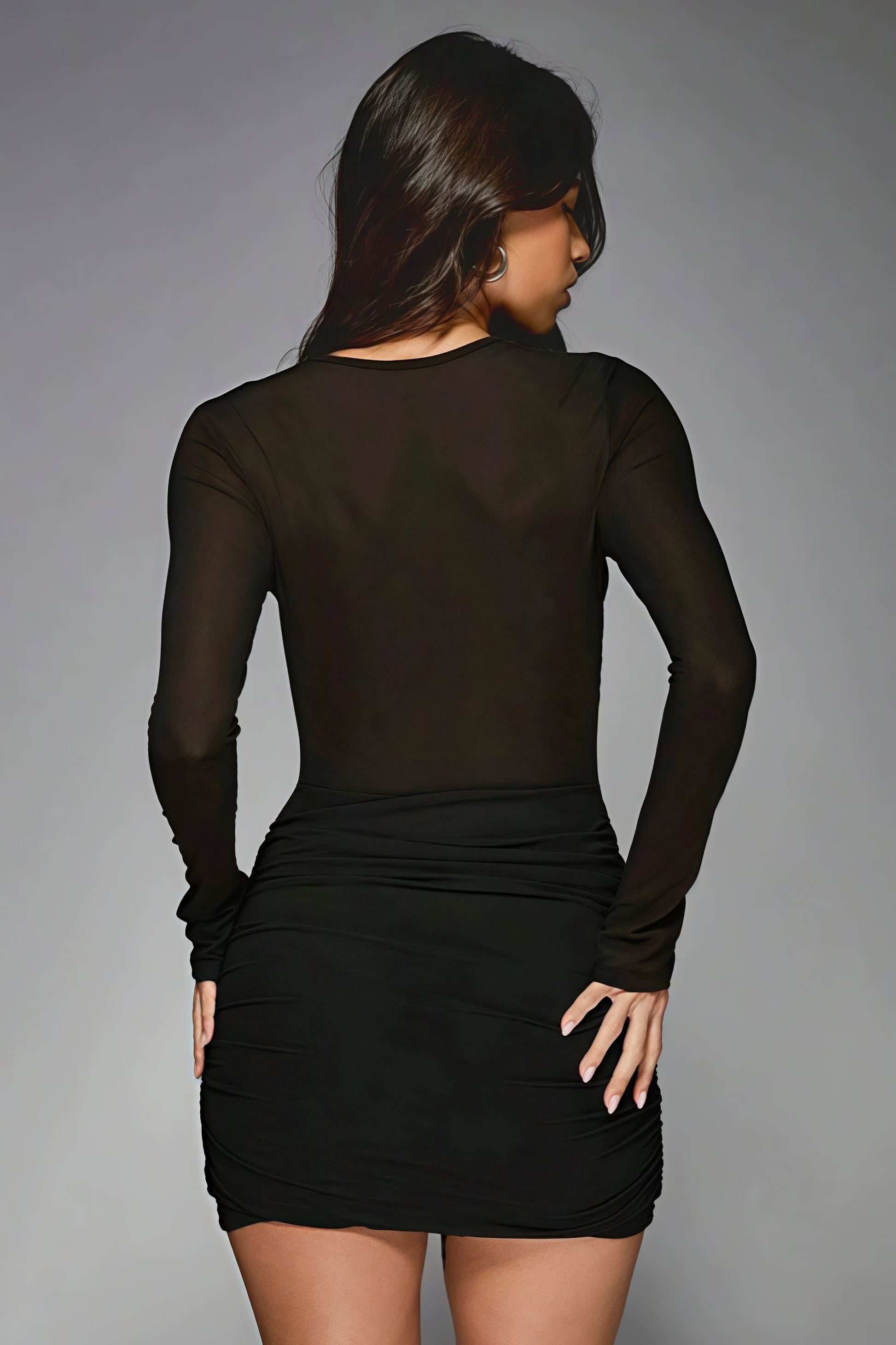 Sheer Mesh Ruched Patchwork Long Sleeve Mini Dress