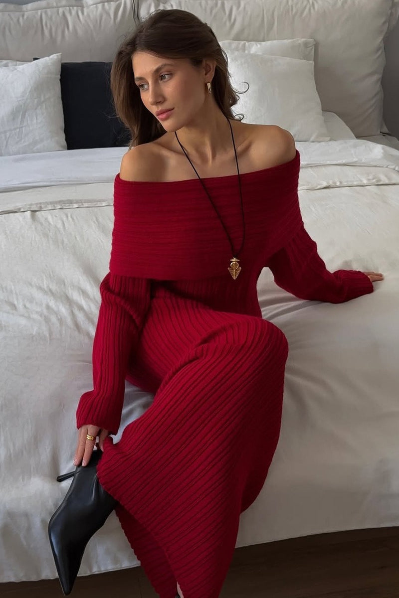 Solid Elegant Minimalist Off Shoulder Bodycon Knit Maxi Dress