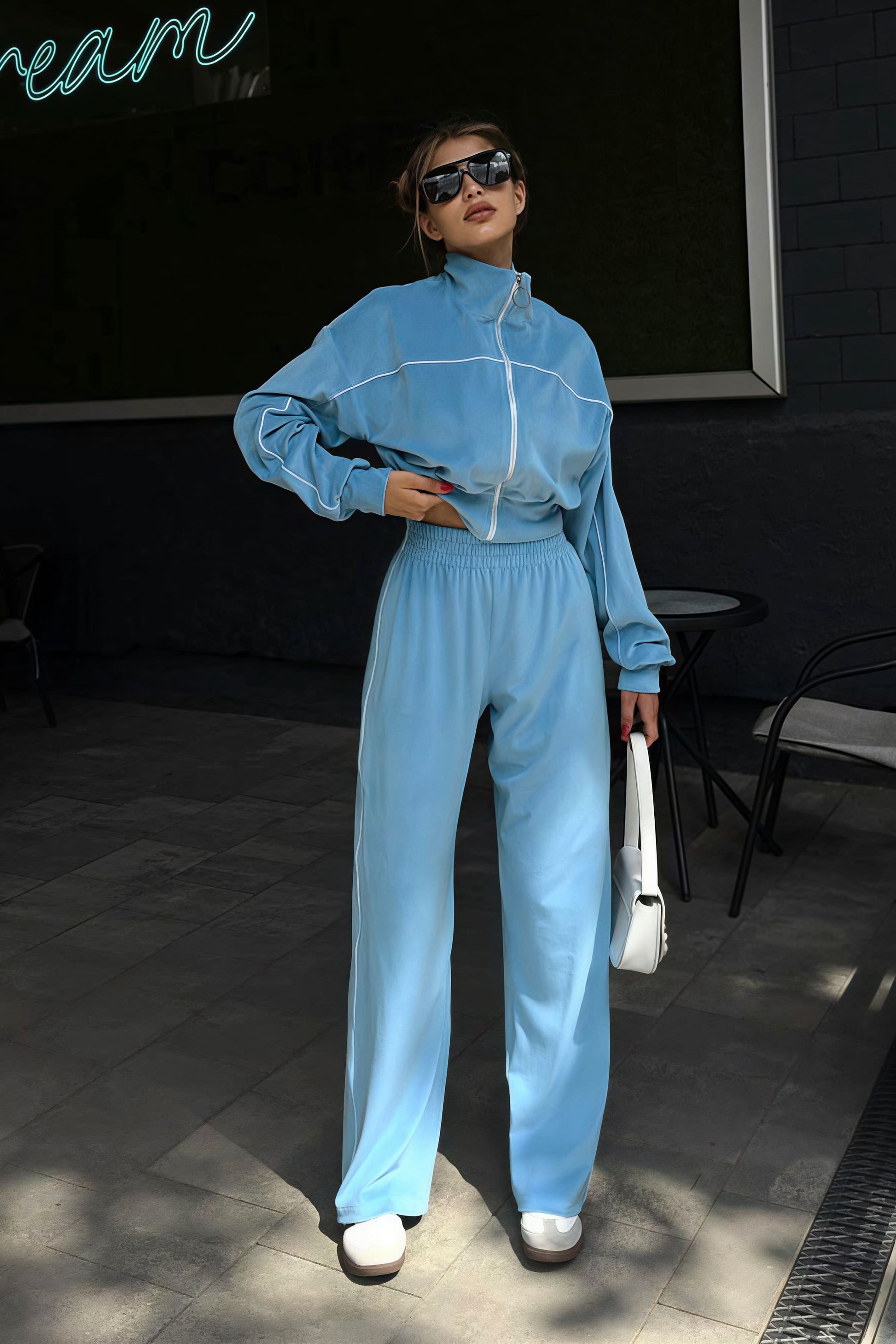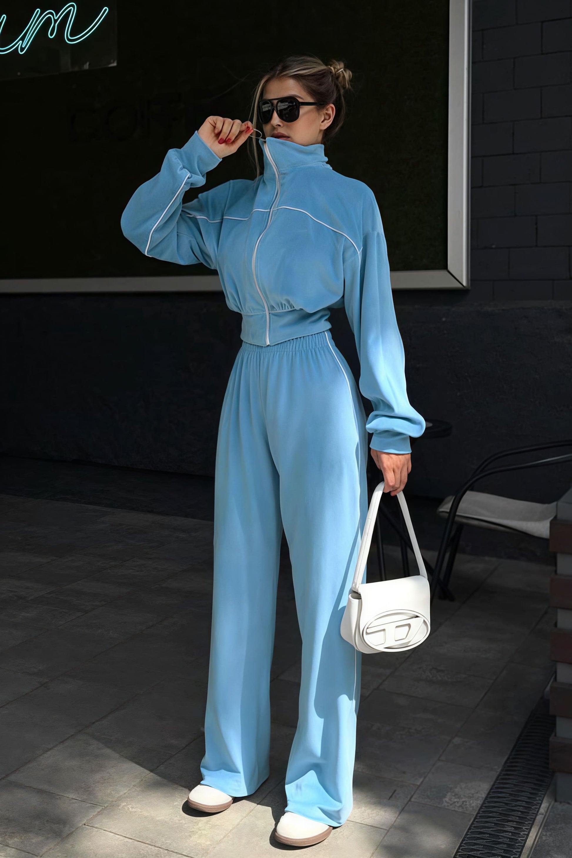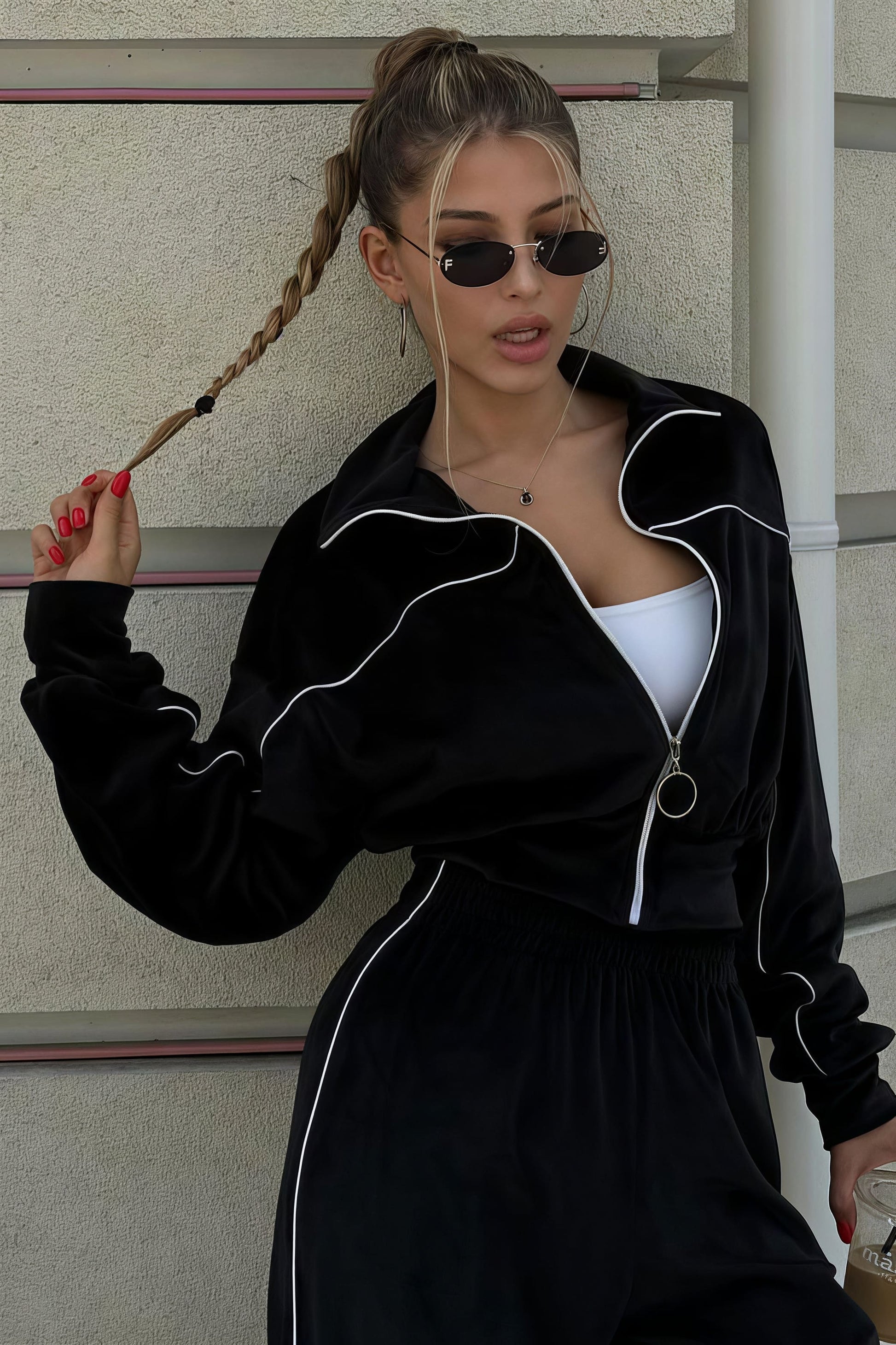 Athletic Velvet Collar Zipper Long Sleeve Two Piece Set
