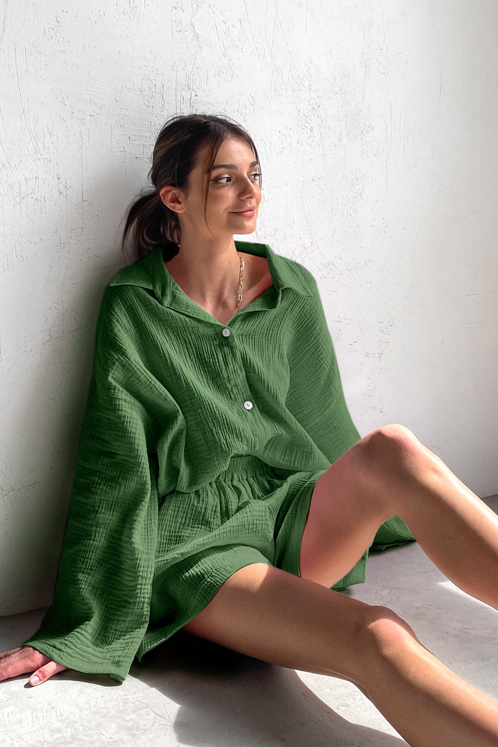 Cotton Long Sleeve Shirt Wide Leg Pants Two Piece Set