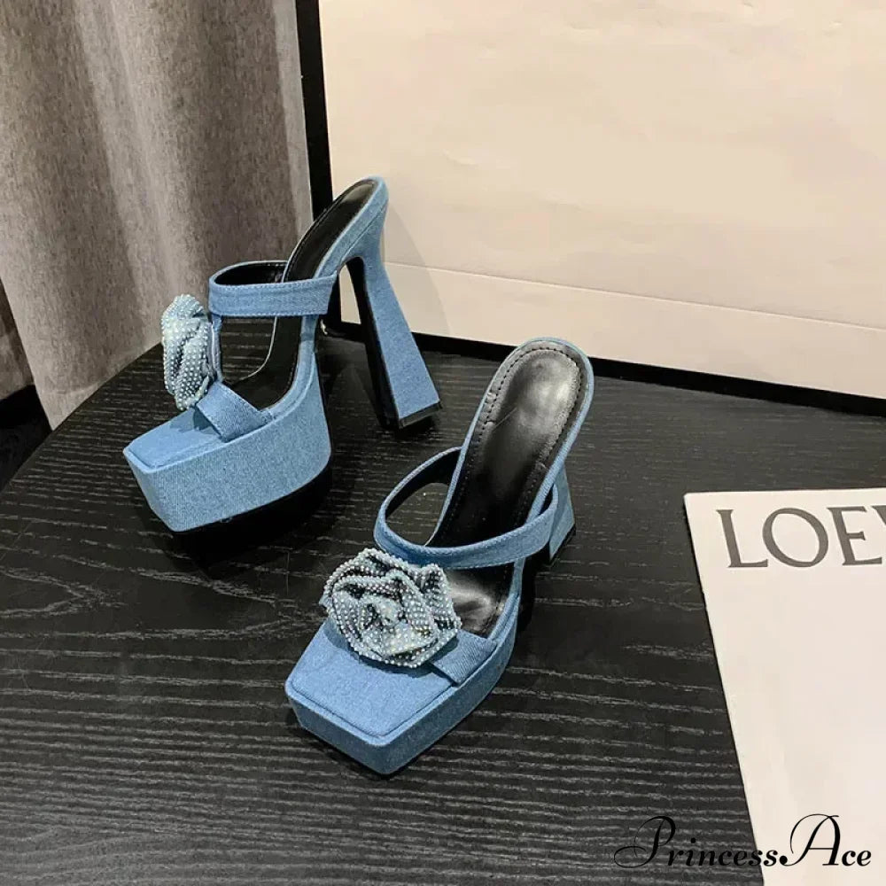New Denim Blue Rhinestone Rose Flower Chic Peep Toe Square High Heels Gladiator High Heel