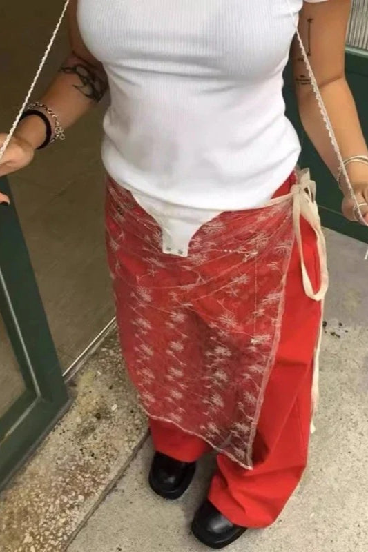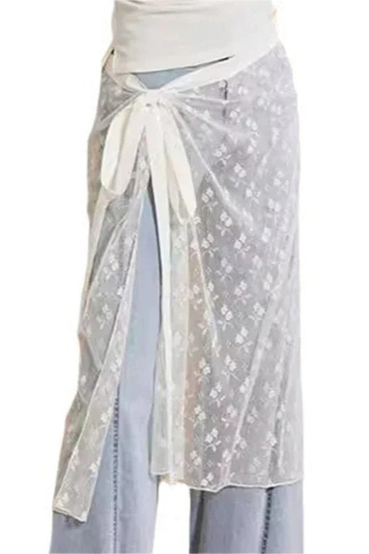 Aesthetic See Through Sequins Flower Lace Long Apron Skirt