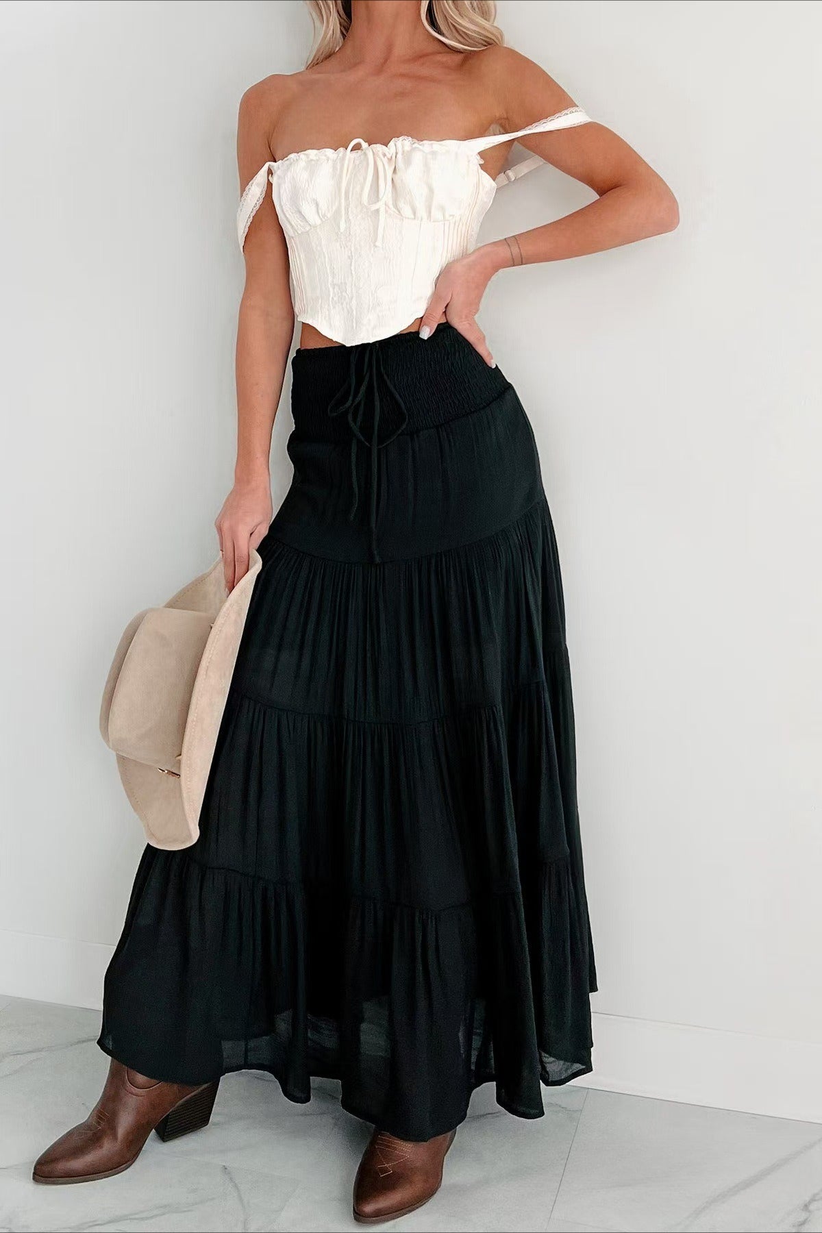 Boho Chic High Waisted Contrast Drawstring A Line Maxi Skirt