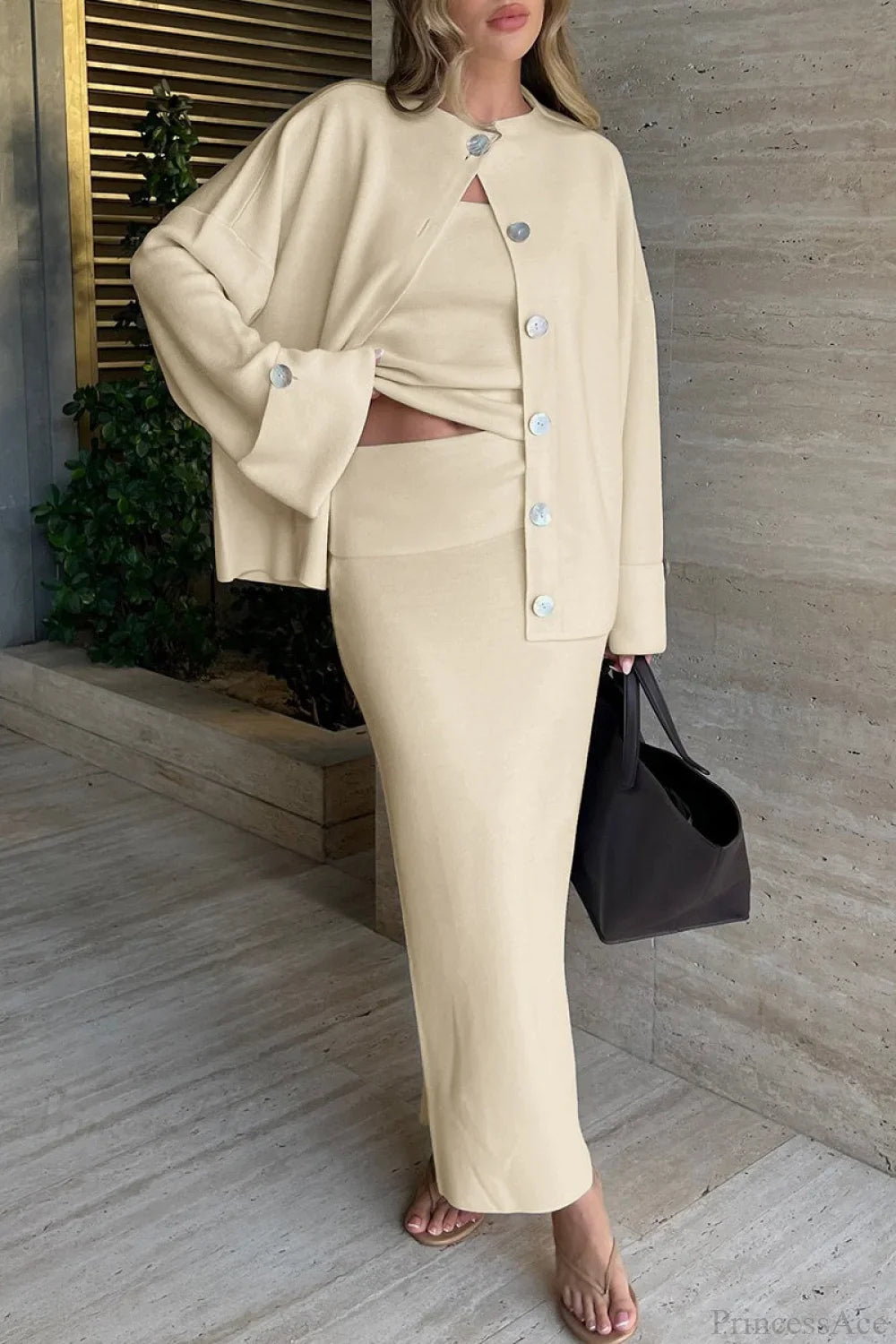 Solid Soft Minimalist Knit Cami Midi Skirt Three Piece Set