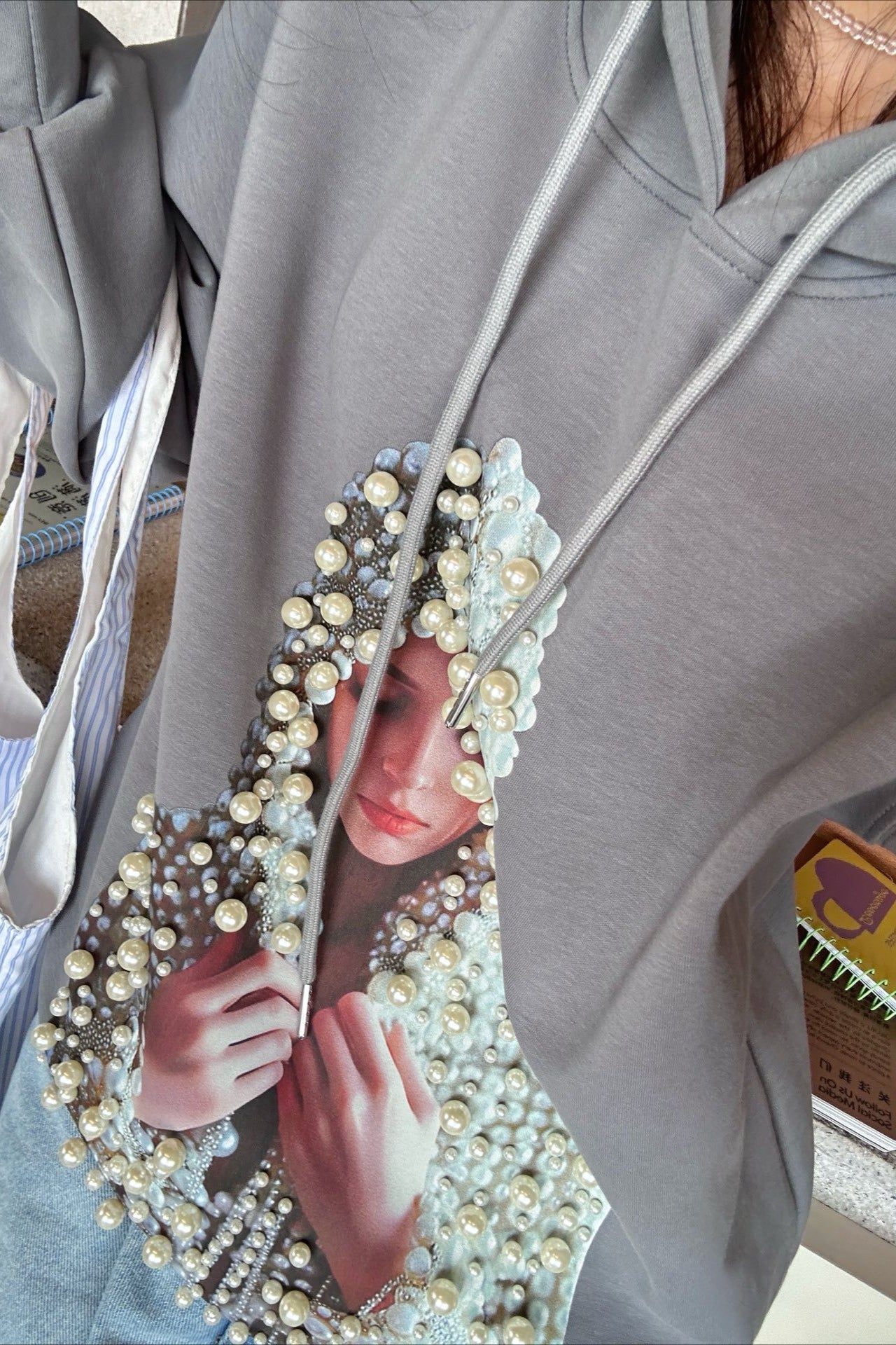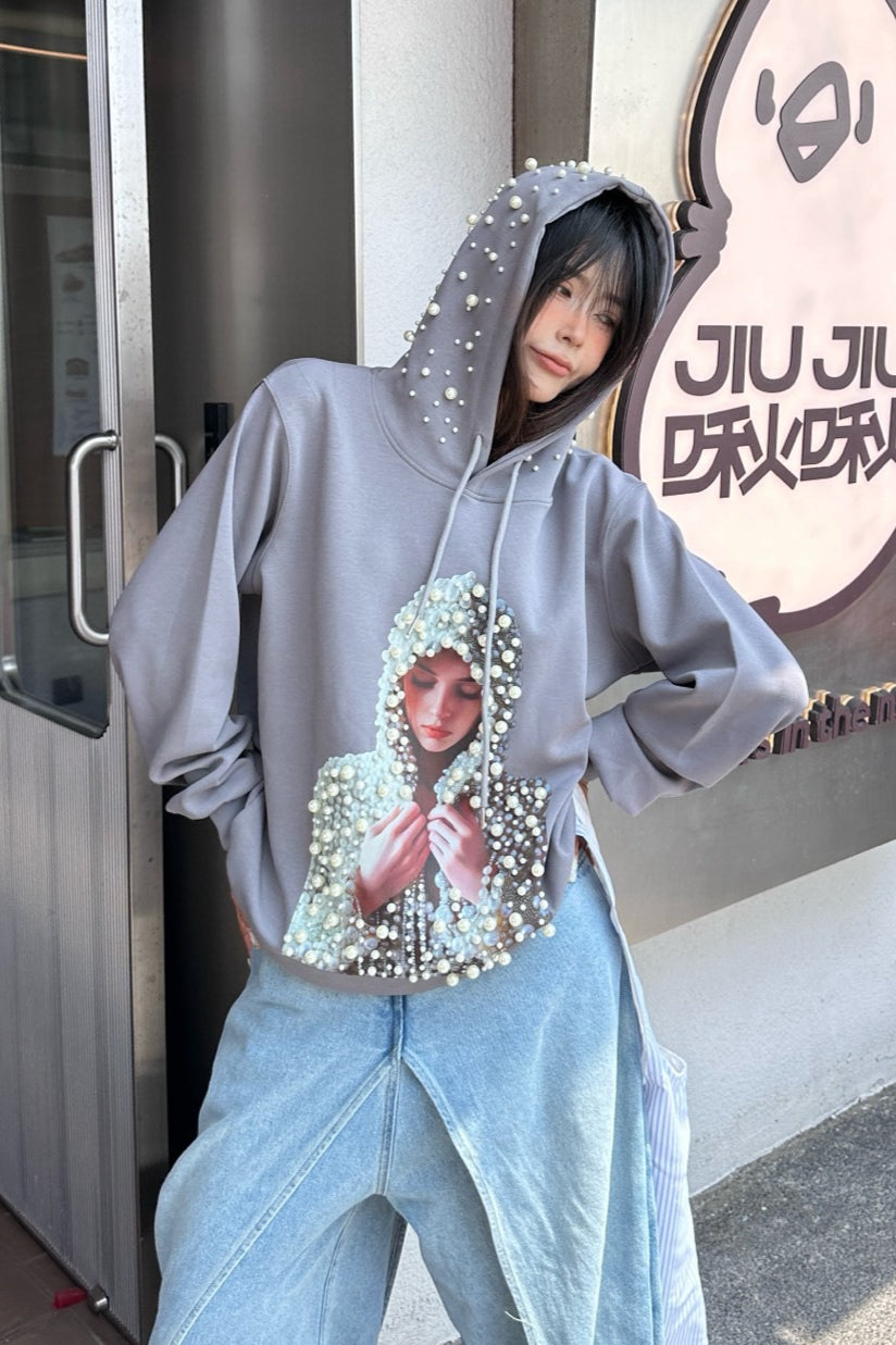 Beaded Graphic Print Edgy Streetwear Hooded Oversized Hoodie