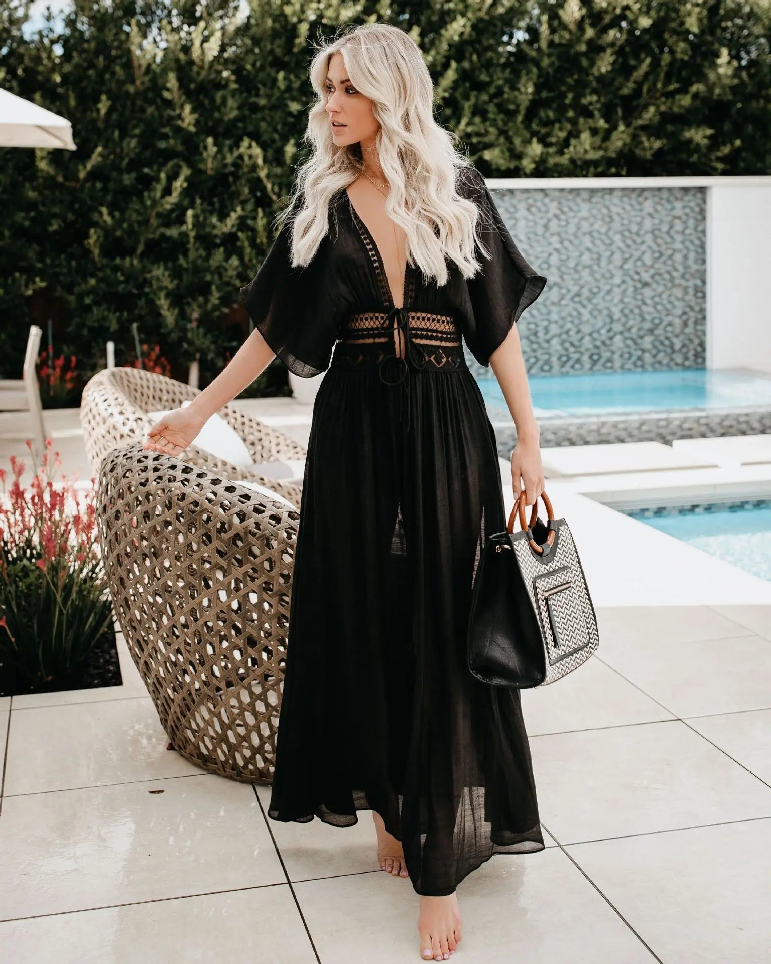 Sexy Deep V-neck White Lace Boho Kimono Bikini Cover up