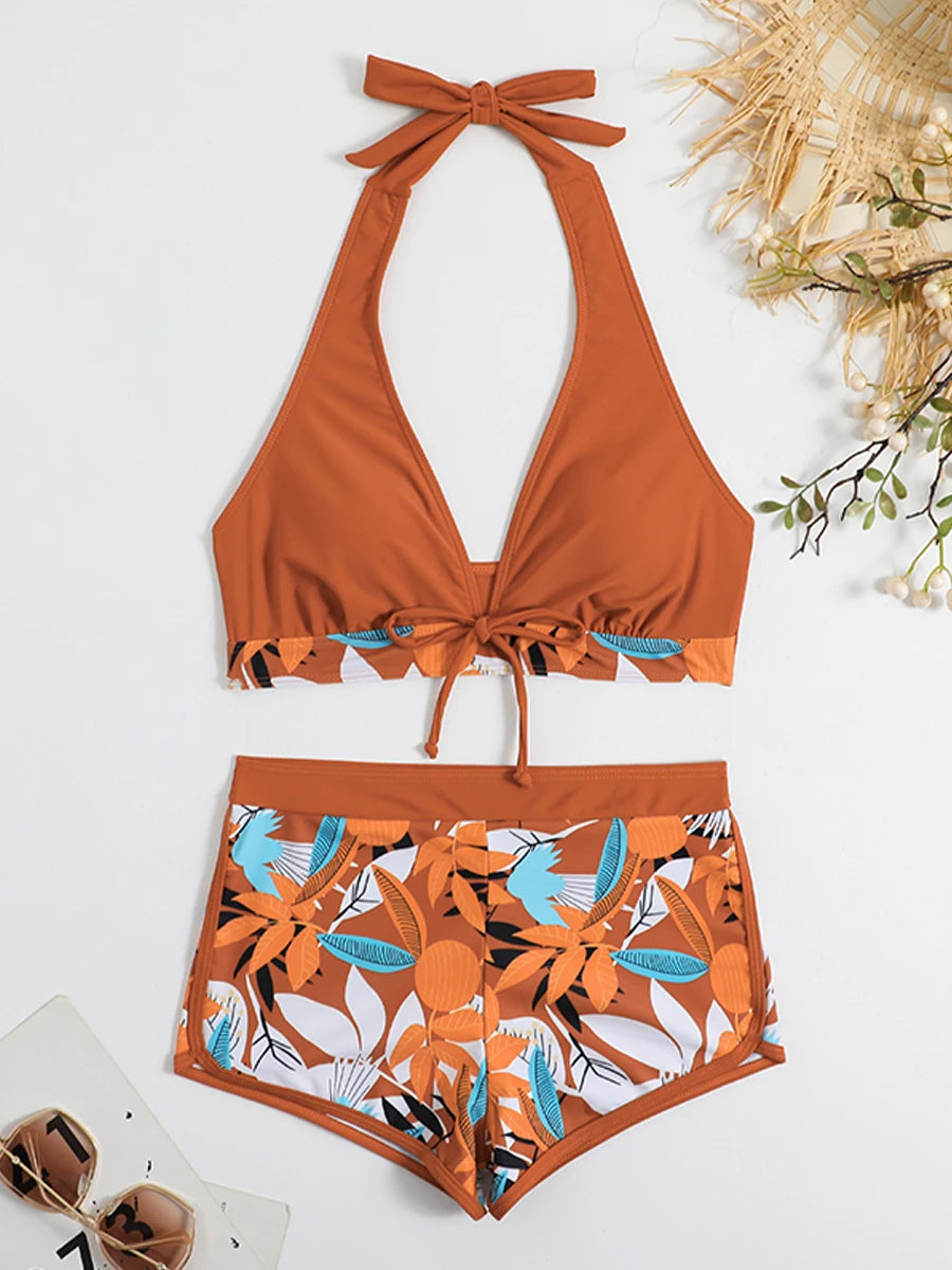 Leaf Print Knot Front Halter Two Piece Set
